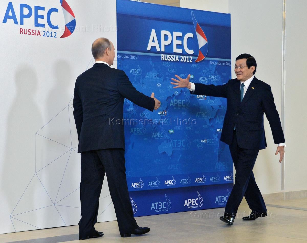 Саммит Азиатско-Тихоокеанского экономического сотрудничества (АТЭС - APEC) во Владивостоке. Президент России Владимир Путин (слева) и президент Социалистической Республики Вьетнам Чыонг Тан Шанг (справа) перед первым пленарным заседанием лидеров экономик АТЭС.