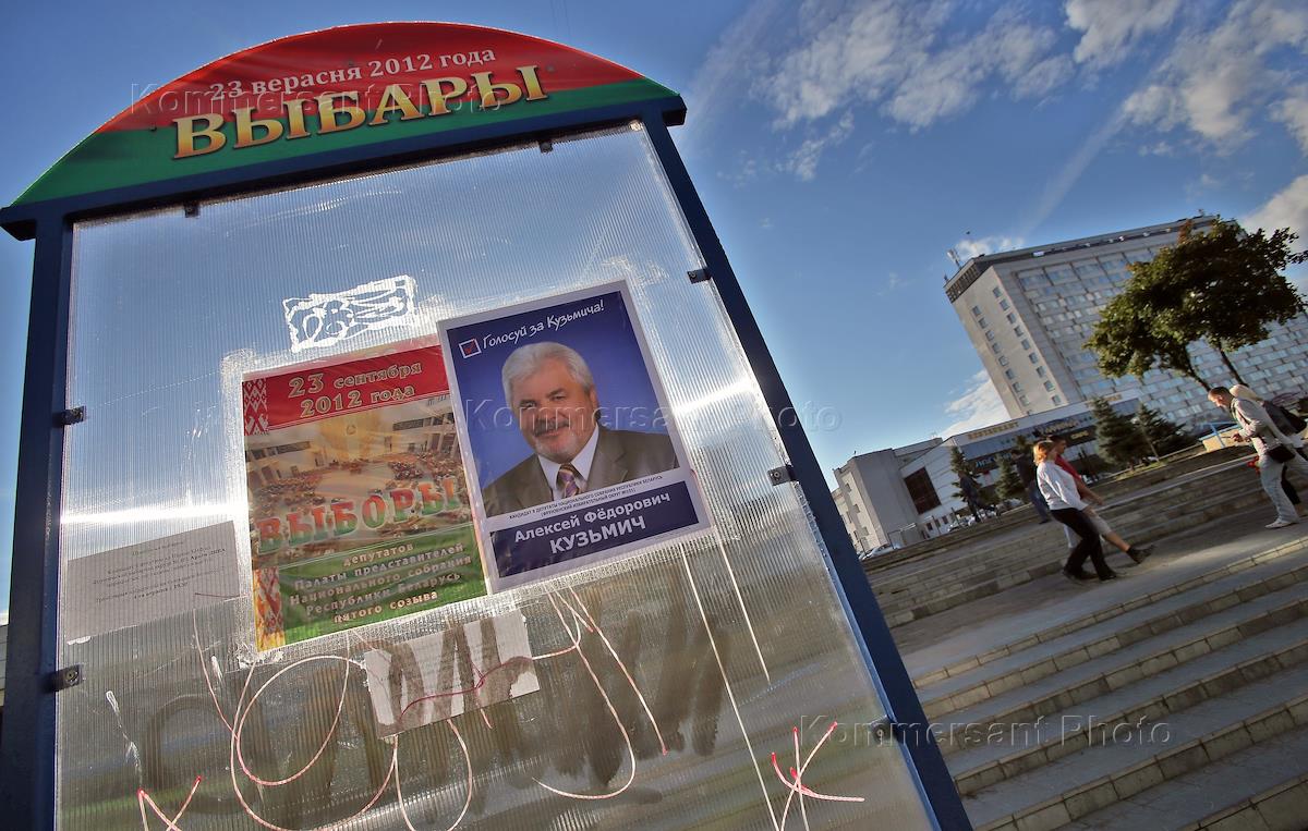 Виды Минска. Информационные стенды, установленные для агитационных листовок кандидатов в депутаты нижней палаты парламента - палату представителей.