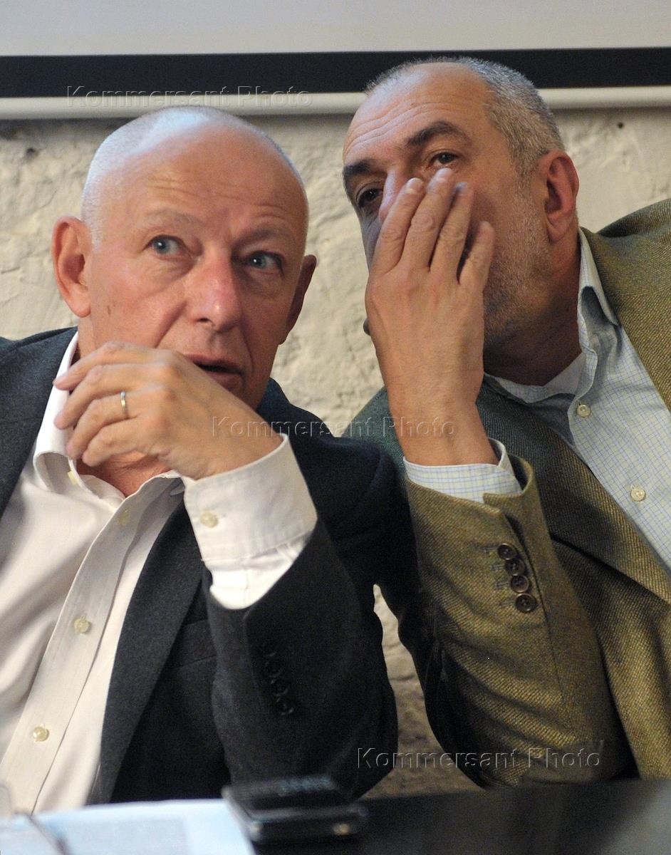 Искусствовед, художественный критик, куратор, директор Института проблем современного искусства Иосиф Бакштейн (слева) и генеральный директор Государственного центра современного искусства Михаил Миндлин (справа) во время пресс-конференции, посвященной новому проекту - Московской неделе искусств. Пресс-конференция прошла на территории "Красного Октября".