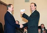Acting President Vladimir Putin (left) gets the presidential registration certificate from hands of the Chief election commissioner Alexander Veshnyakov (right)