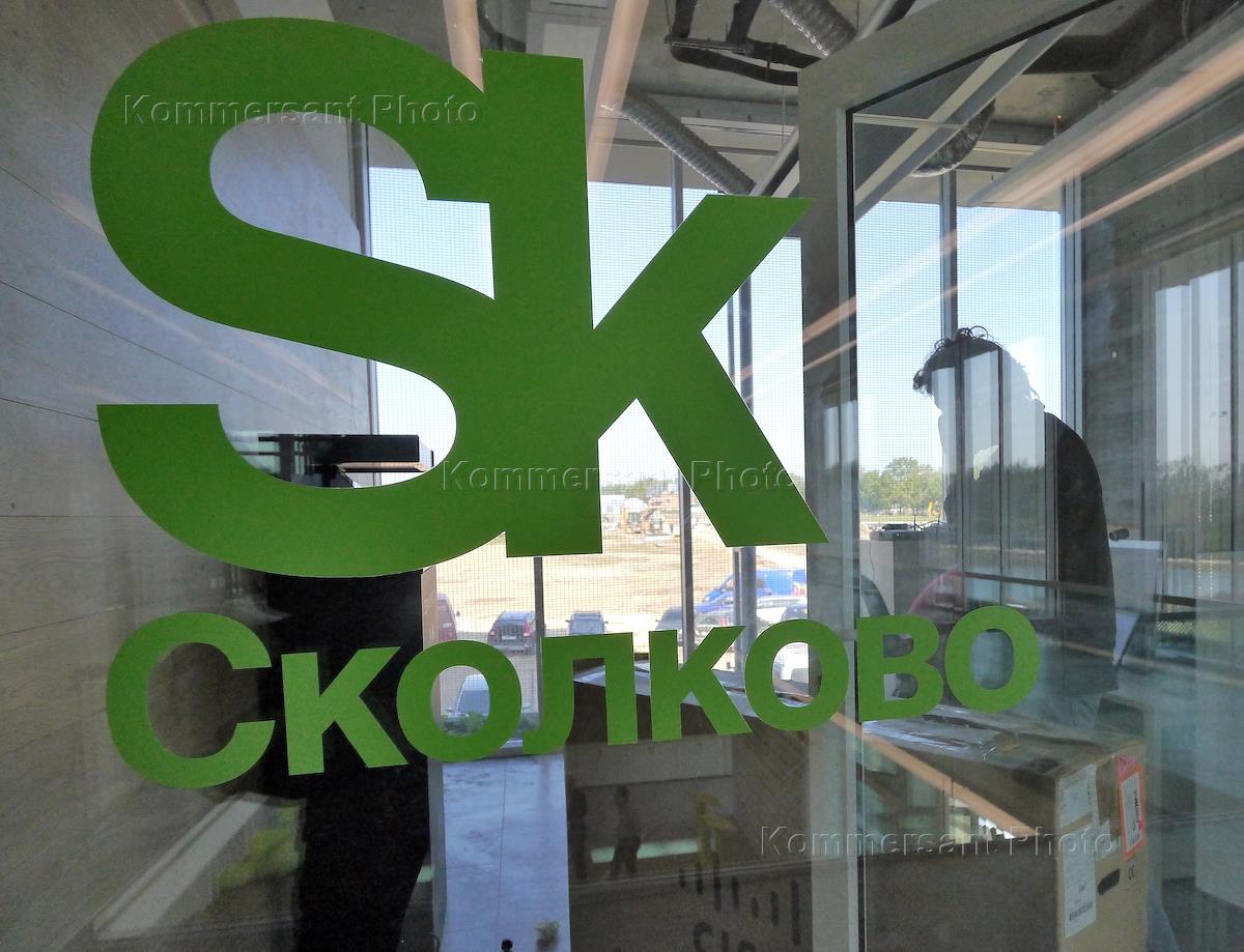 Инновационный центр "Сколково". Надпись "Сколково" на стеклянной двери.