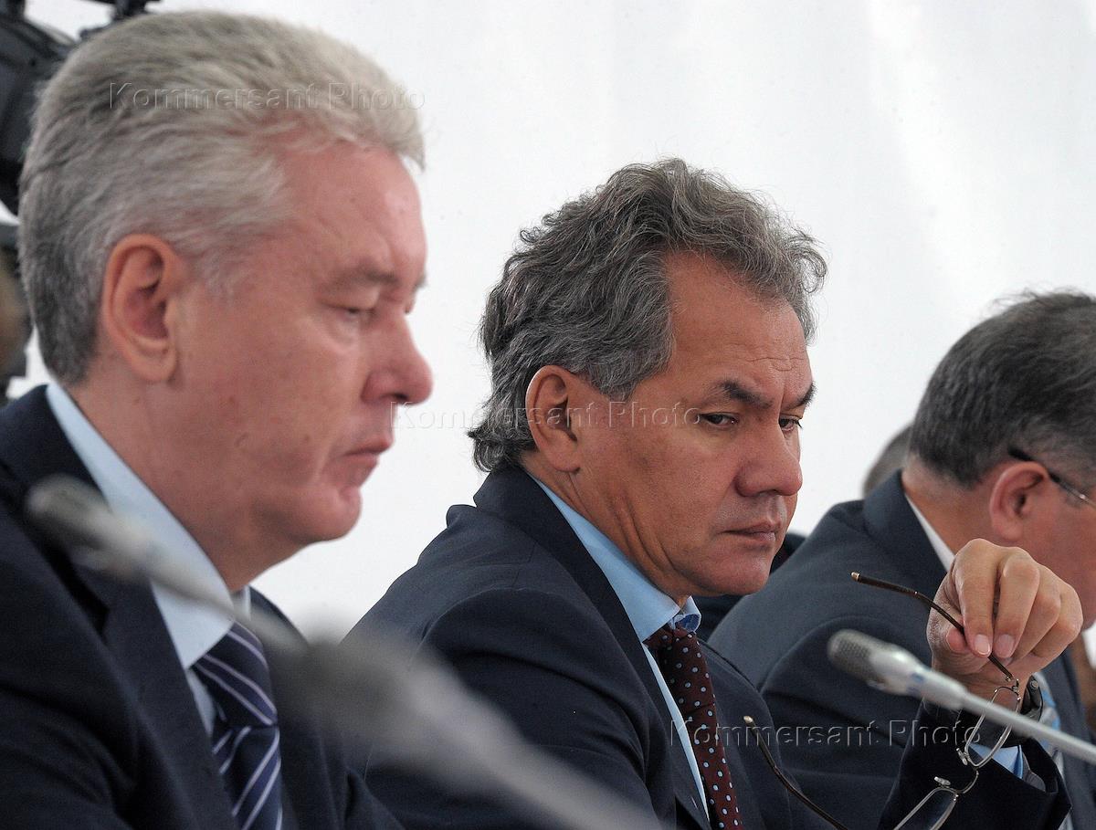 Мэр Москвы Собянин Сергей (слева) и губернатор Московской области Сергей Шойгу (справа) на совещании по вопросу развития Московского транспортного узла участока дороги на пересечении федеральной автомобильной трассы М1 "Беларусь" и строящейся платной дороги в обход города Одинцово.