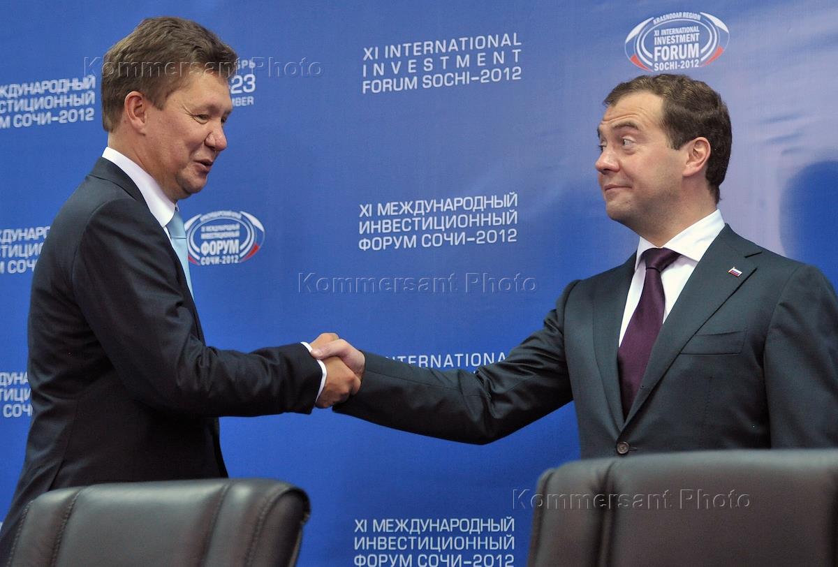 XI International Investment Forum "Sochi-2012". Chairman of the Board of "Gazprom" Alexey Miller (left) and Russian Prime Minister Dmitry Medvedev (right) at the signing ceremony of a cooperation agreement on the sharing and creation of infrastructure for development of offshore fields between "Gazprom" and "NK"Rosneft".