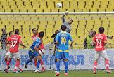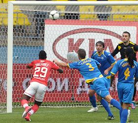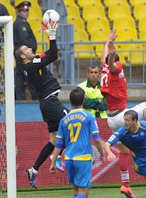 Чемпионат России по футболу. 9-й тур. Матч между командами "Спартак" (Москва) - "Ростов" (Ростов-на-Дону). Вратарь команды "Спартак" Андрей Дикань(сверху в центре) на стадионе СК "Лужники".