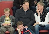 Континентальная хоккейная лига (КХЛ). Матч между командами ЦСКА (Москва) - "Авангард" (Омск). Главный тренер команды ЦСКА Леонид Слуцкий (в центре) и футболист сборной России Денис Колодин (справа) во время матча во дворце спорта "Мегаспорт".