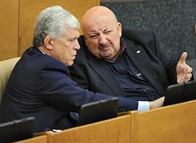 Член комитета Государственной думы (ГД) по труду, социальной политике и делам ветеранов Валерий Трапезников (слева) и член комитета ГД России по экономической политике, инновационному развитию и предпринимательству Илья Пономарев (справа) во время думского заседания.