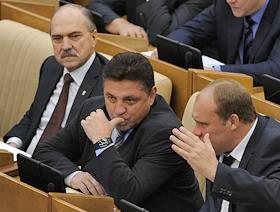 Член комитета Государственной думы России по делам общественных объединений и религиозных организаций Алексей Митрофанов (в центре) во время думского заседания.