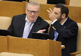 Лидер Либерально-демократической партии России (ЛДПР), член комитета Государственной думы (ГД) России по обороне Владимир Жириновский (слева) и член комитета ГД России по экономической политике, инновационному развитию и предпринимательству Илья Пономарев (справа) во время думского заседания.