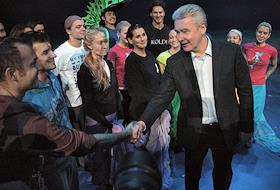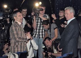 Генеральный директор компании Stage Entertainment Russia Дмитрий Богачев (слева) и мэр Сергей Собянин (справа) во время посещения церемонии официального открытия театра "Россия" на Пушкинской площади.