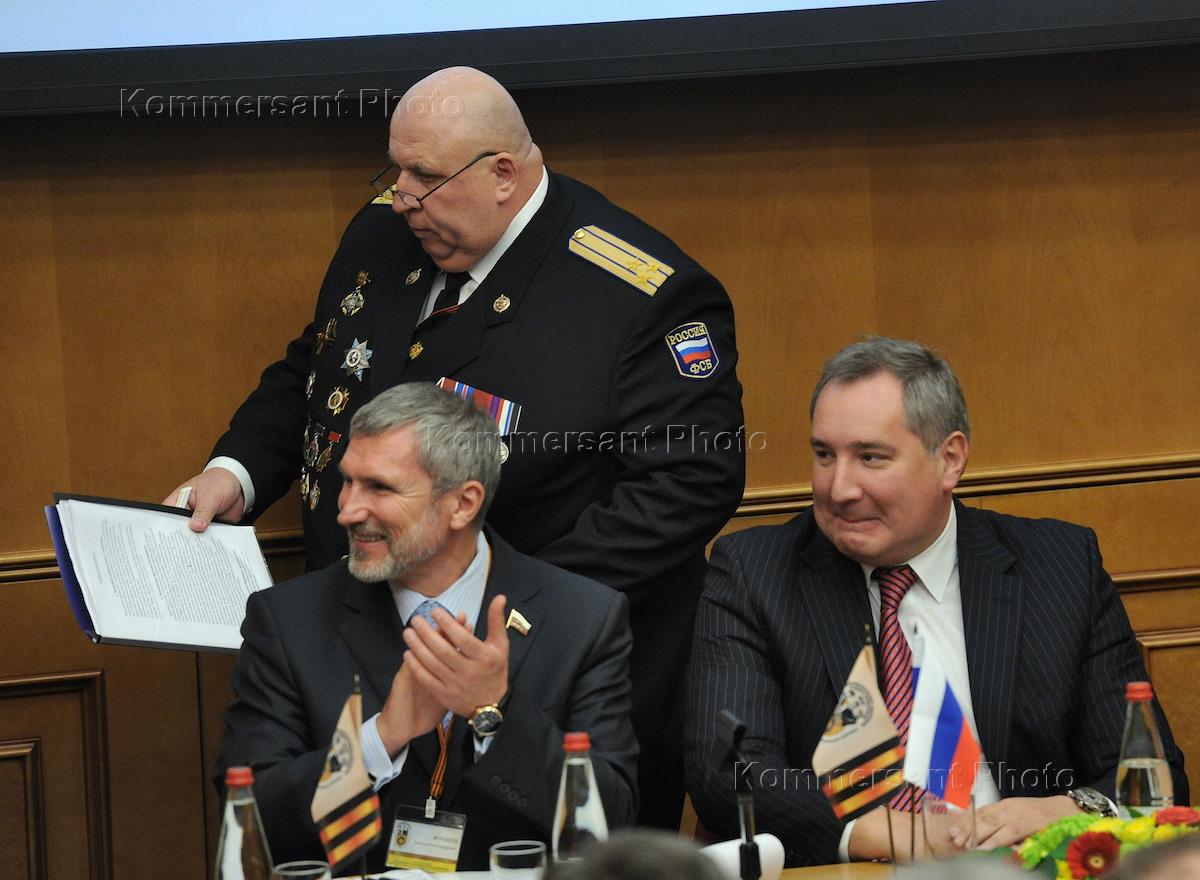 Учредительный съезд Добровольческого движения особого назначения (ДОН) в поддержку армии, флота и оборонно-промышленного комплекса. Лидер партии "Родина", депутат Государственной думы Алексей Журавлев (слева) и заместитель председателя правительства России Дмитрий Рогозин (справа) во время зеседания в конференц-зале "Ярославль" гостиницы "Золотое Кольцо".