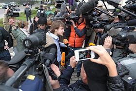 Адвокаты Pussy Riot Марк Фейгин (в центре) и Виолетта Волкова (справа) после заседания Московского городского суда, где рассматривалась кассационная жалоба на приговор участницам панк-группы Pussy Riot.