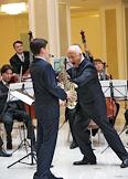 Дирижер оркестра "Виртуозы Москвы" Владимир Спиваков (справа) и саксофонист Матвей Шерлинг (слева) во время концерта оркестра "Виртуозы Москвы" в здании Совета Федерации России.