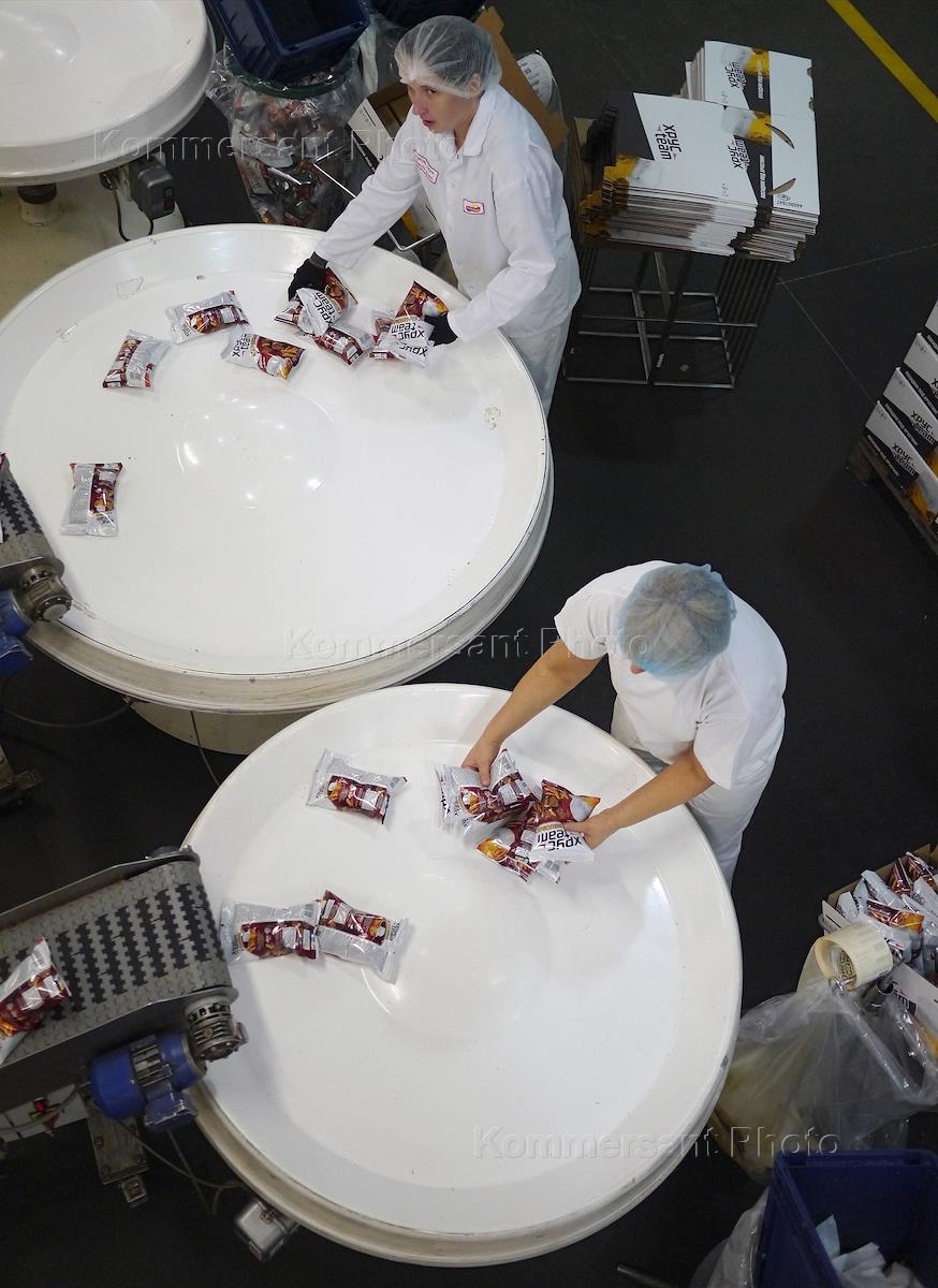 Завод по производству известных снэковых брендов компании PepsiCo. Производство чипсов. Цех фасовки.