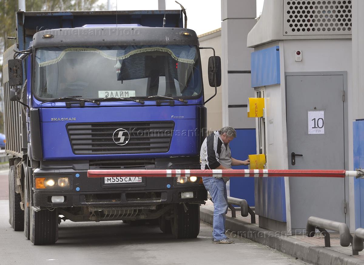 Открытие платного участка автодороги М4 "Дон" в Московской области. Грузовик на контрольно-пропускном пункте.