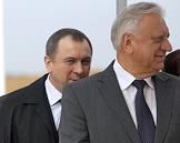 Министр иностранных дел Беларуси Владимир Макей (слева) и премьер-министр Беларуси Михаил Мясникович (справа) во время церемонии закладки капсулы с посланием потомкам на месте, где планируется усовершенствовать производство железнодорожного и городского пассажирского электрического транспорта.