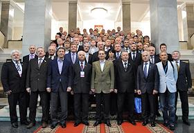Председатель Государственной думы (ГД) России Сергей Нарышкин (первый ряд, в центре) и его первый заместитель, президент Олимпийского комитета России Александр Жуков (первый ряд, третий слева) во время презентации Зимних Олимпийских игр в Сочи в 2014 и Чемпионата мира по футболу в 2018 в ГД России в рамках проведения Международных парламентских игр.