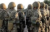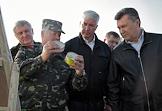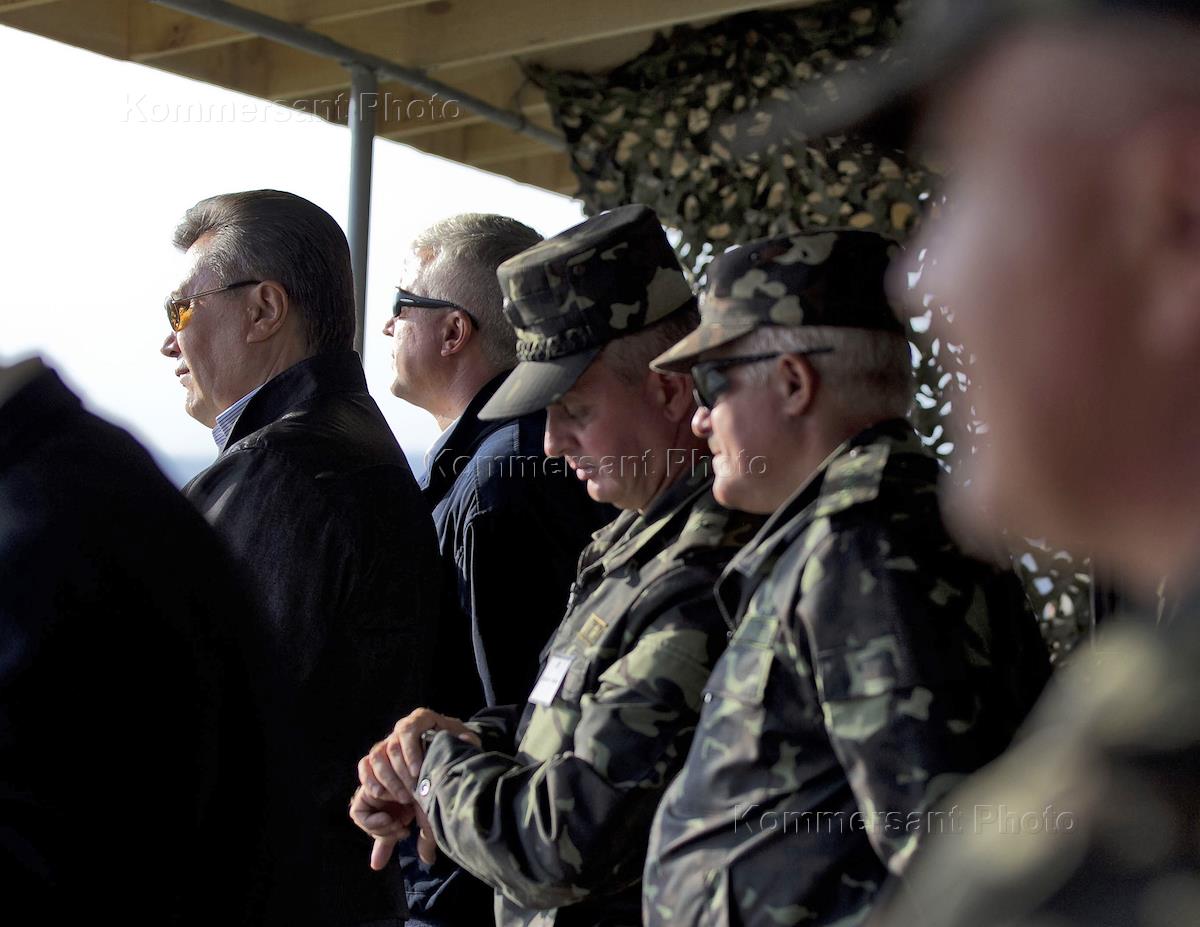 Президент Украины Виктор Янукович (на дальнем плане) во время посещения 240-го центра подготовки подразделений 8-го армейского корпуса ВСУ в Житомирской области.