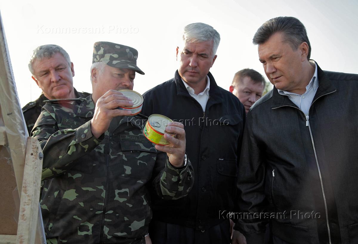 Бывший министр Украины Михаил Ежель (второй слева), министр обороны Украины Дмитрий Саламатин (второй справа) и президент Украины Виктор Янукович (справа) во время посещения 240-го центра подготовки подразделений 8-го армейского корпуса ВСУ в Житомирской области.