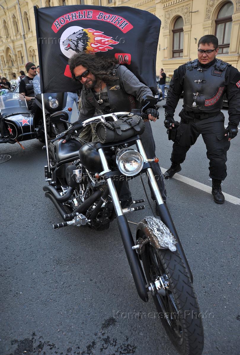 Лидер байкерского клуба "Ночные волки" Александр Залдостанов ("Хирург") (справа) во время проведения мотопробега "Ран по семи холмам" по культурным памятникам города.