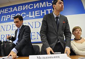 Руководитель аналитического отдела ассоциации "Голос" Александр Кынев (слева) и заместитель директора ассоциации "Голос" Григорий Мельконьянц (в центре) во время пресс-конференции на тему: "Второе заявление ассоциации "Голос" по результатам долгосрочного наблюдения хода избирательных кампаний региональных и местных выборов, назначенных на 14 октября 2012 года. Этап агитационной кампании". Пресс-конференция прошла в "Независимом пресс-центре".