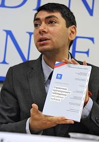 Заместитель директора ассоциации "Голос" Григорий Мельконьянц во время пресс-конференции на тему: "Второе заявление ассоциации "Голос" по результатам долгосрочного наблюдения хода избирательных кампаний региональных и местных выборов, назначенных на 14 октября 2012 года. Этап агитационной кампании". Пресс-конференция прошла в "Независимом пресс-центре".