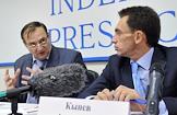 Председатель Межрегионального объединения избирателей Андрей Бузин (слева) и руководитель аналитического отдела ассоциации "Голос" Александр Кынев (справа) во время пресс-конференции на тему: "Второе заявление ассоциации "Голос" по результатам долгосрочного наблюдения хода избирательных кампаний региональных и местных выборов, назначенных на 14 октября 2012 года. Этап агитационной кампании". Пресс-конференция прошла в "Независимом пресс-центре".