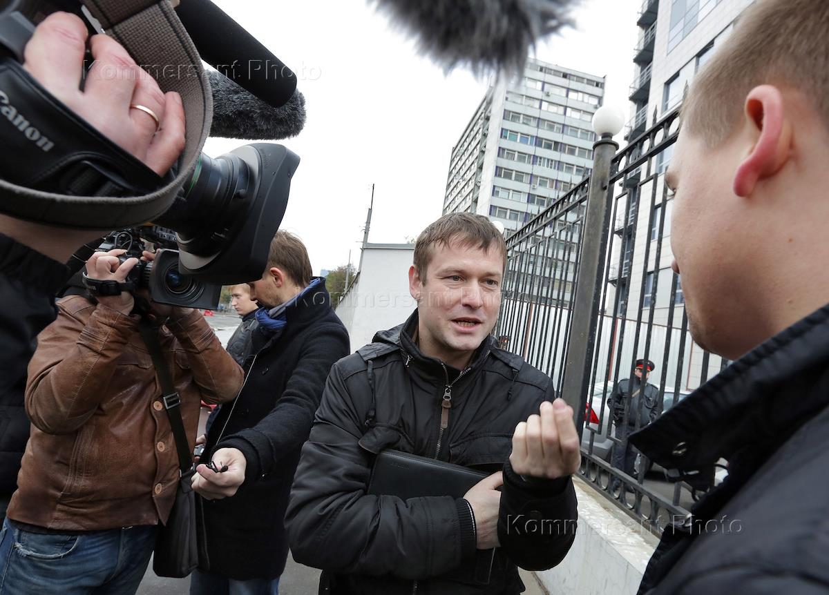 Помощник депутата Госдумы Ильи Пономарева, соратник лидера "Левого фронта" Сергея Удальцова, оппозиционер Леонид Развозжаев (в центре) перед началом допроса Сергея Удальцова в Следственном комитете России в рамках проверки фактов, изложенных в фильме "Анатомия протеста-2", вышедшем на телеканале НТВ.