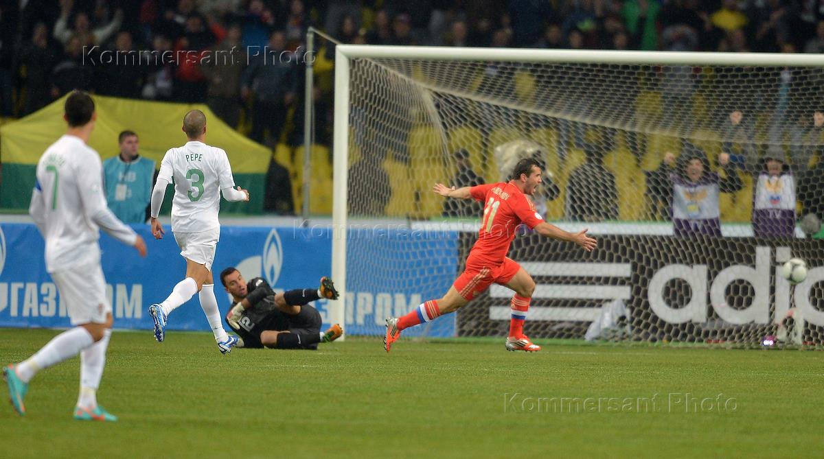 Отборочный матч чемпионата мира-2014 по футболу. Игрок сборной команды России Дмитрий Комбаров (в центре) во время матча между командами национальных сборных России и Португалии на Большой спортивной арене (БСА) спорткомплекса "Лужники".