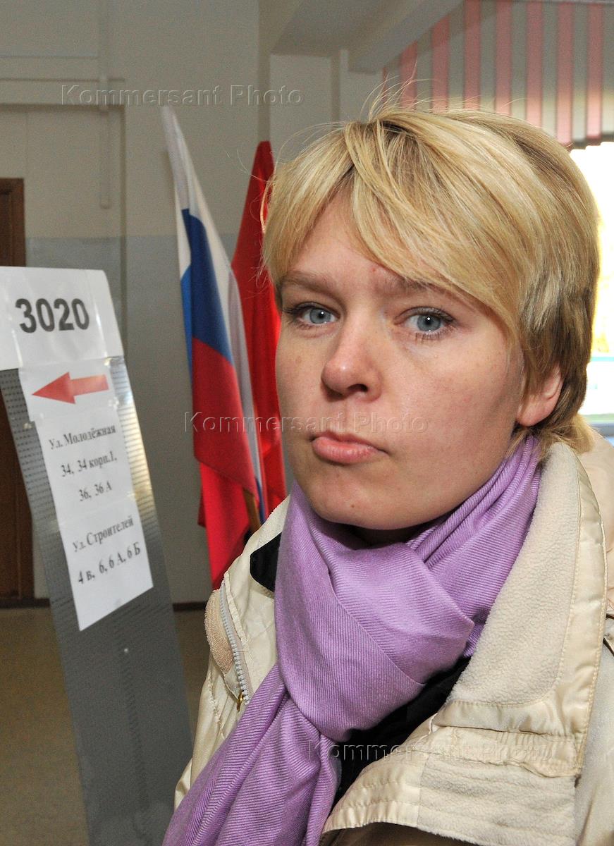 "Единый день голосования в Российской Федерации - 14 октября 2012 года". Выборы мэра Химок. Лидер движения по защите Химкинского леса, кандидат в мэры Химок Евгения Чирикова на избирательном участке.