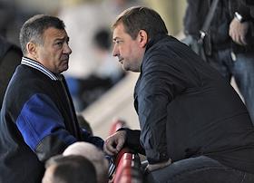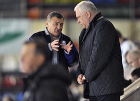 Континентальная хоккейная лига (КХЛ). Матч между командами "Динамо" (Москва) и "Амур" (Хабаровск) прошел на малой спортивной арене "Лужники". Президент хоккейного клуба "Динамо" Аркадий Ротенберг (слева) и спецпредставитель президента России по взаимодействию с экспортерами газа Виктор Зубков (справа) на трибуне во время матча.
