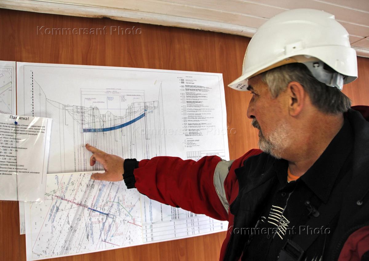 Зона Сайменского канала. Строительство тоннеля под Сайменским каналом для прокладки трубы 2-й ветки газопровода "Северный поток". Главный специалист ООО "Стройгазмонтаж" Александр Бакшеев у схемы тоннеля.