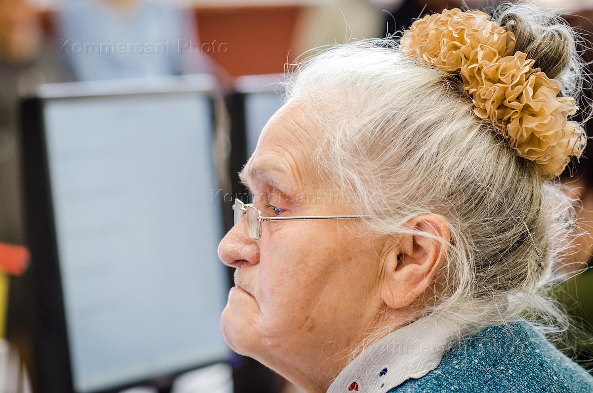 II Всероссийский чемпионат по компьютерному многоборью среди пенсионеров прошел во Дворце творчества детей и молодежи. Пенсионерка работает на компьютере.