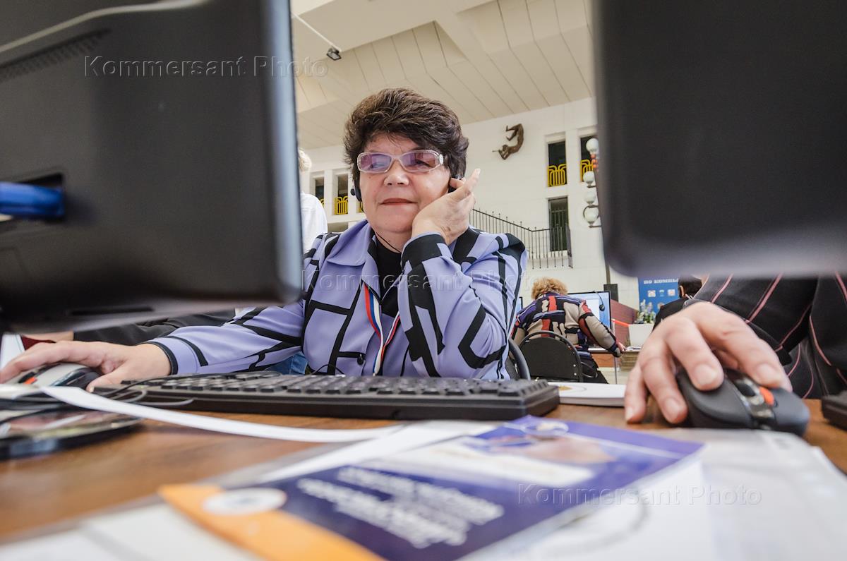 II Всероссийский чемпионат по компьютерному многоборью среди пенсионеров прошел во Дворце творчества детей и молодежи. Пенсионерка работает на компьютере.