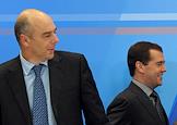 Министр финансов России Антон Силуанов (слева) и председатель правительства России Дмитрий Медведев (справа) во время XXVI пленарного заседания Консультативного совета по инвестициям. Заседание прошло в зале "Владимир" гостиницы "Балчуг Кемпински".