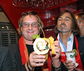 Режиссер Андрей Житинкин (слева) и художник Никас Сафронов (справа) на презентации фотовыставки "Упругие публичности" в ресторан RETE.