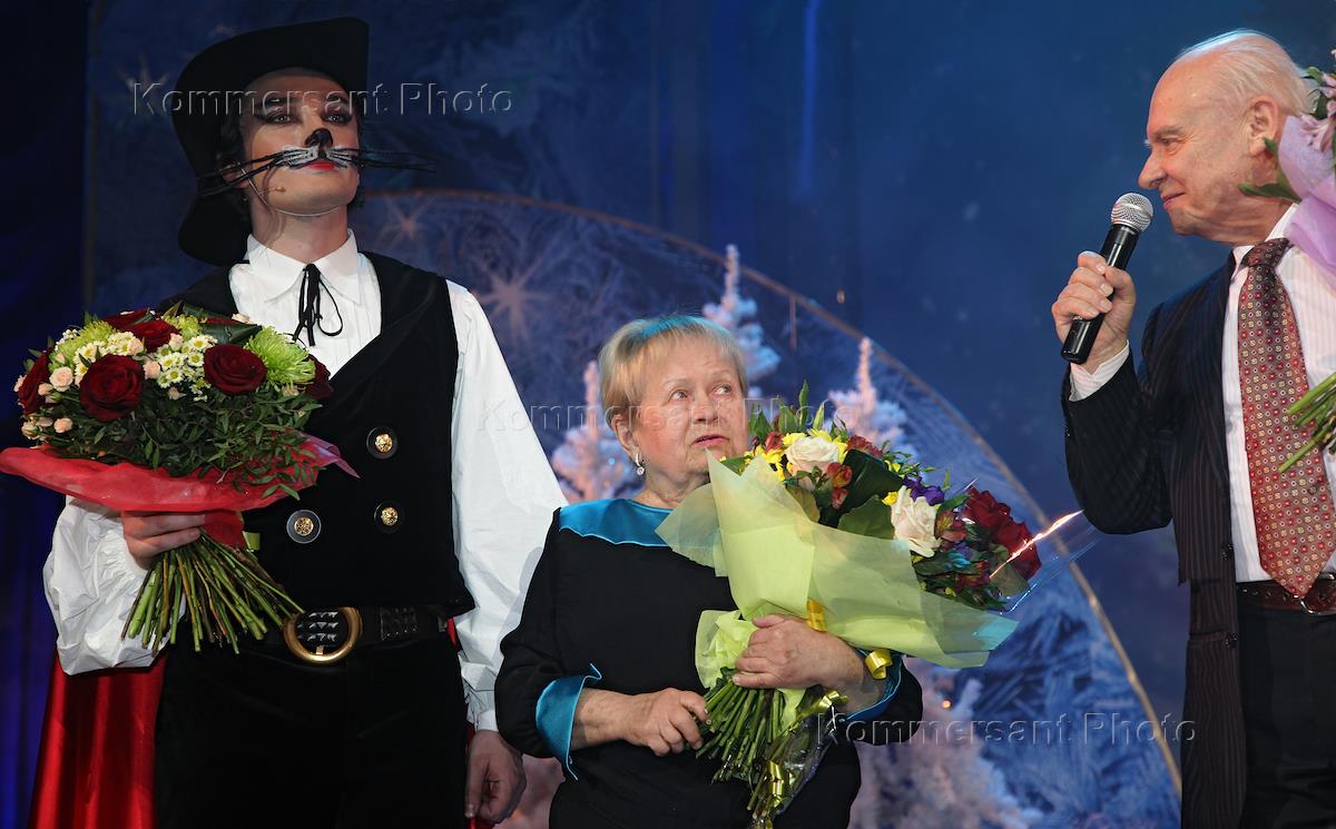 From left to right: singer Philip Cherkasov, composer Aleksandra Pahmutova and poet Nikolay Dobronravov at the premiere of the musical fairy tale "Magical New Year" by composer Alexandra Pahmutova. Premiere was held in the Concert Hall "Academic".
