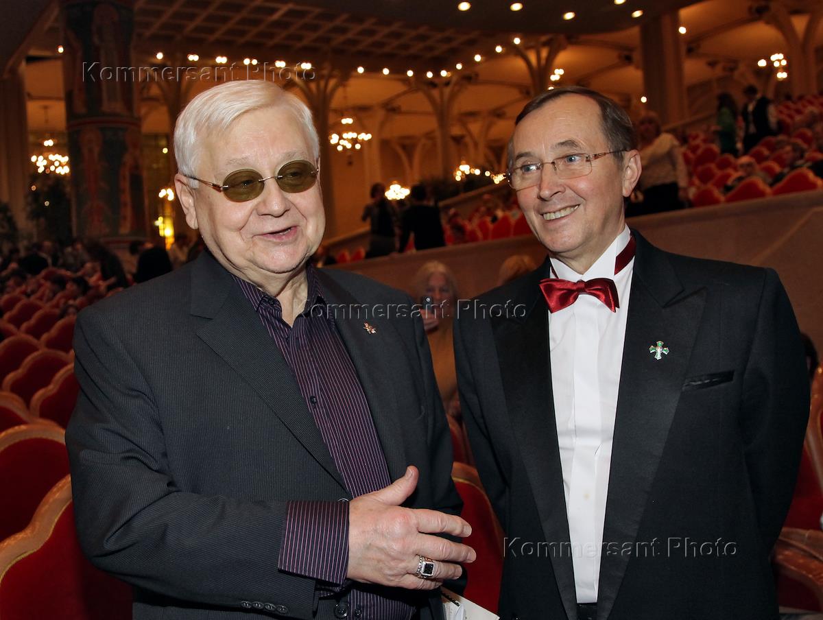 Художественный руководитель Московского художественного театра (МХТ) имени Чехова Олег Табаков (слева) и актер Николай Бурляев (справа) в зале Церковных Соборов Храма Христа Спасителя во время закрытия II Славянского форума искусств "Золотой Витязь".