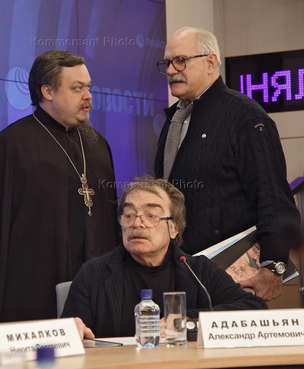 Слева направо: протоиерей, председатель отдела Московской патриархата по взаимоотношениям церкви и общества Всеволод Чаплин, художник, сценарист Александр Адабашьян и председатель союза кинематографистов России, кинорежиссер Никита Михалков во время заседания "круглого стола" на тему: "Ситуация в России – хаос или возрождение?". Заседание состялось в РИА "Новости".