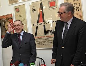 Режиссеры Валерий Золотухин (слева) и Кшиштоф Занусси во время пресс-показа спектакля "Король умирает". Спектакль прошел в театре на Таганке.