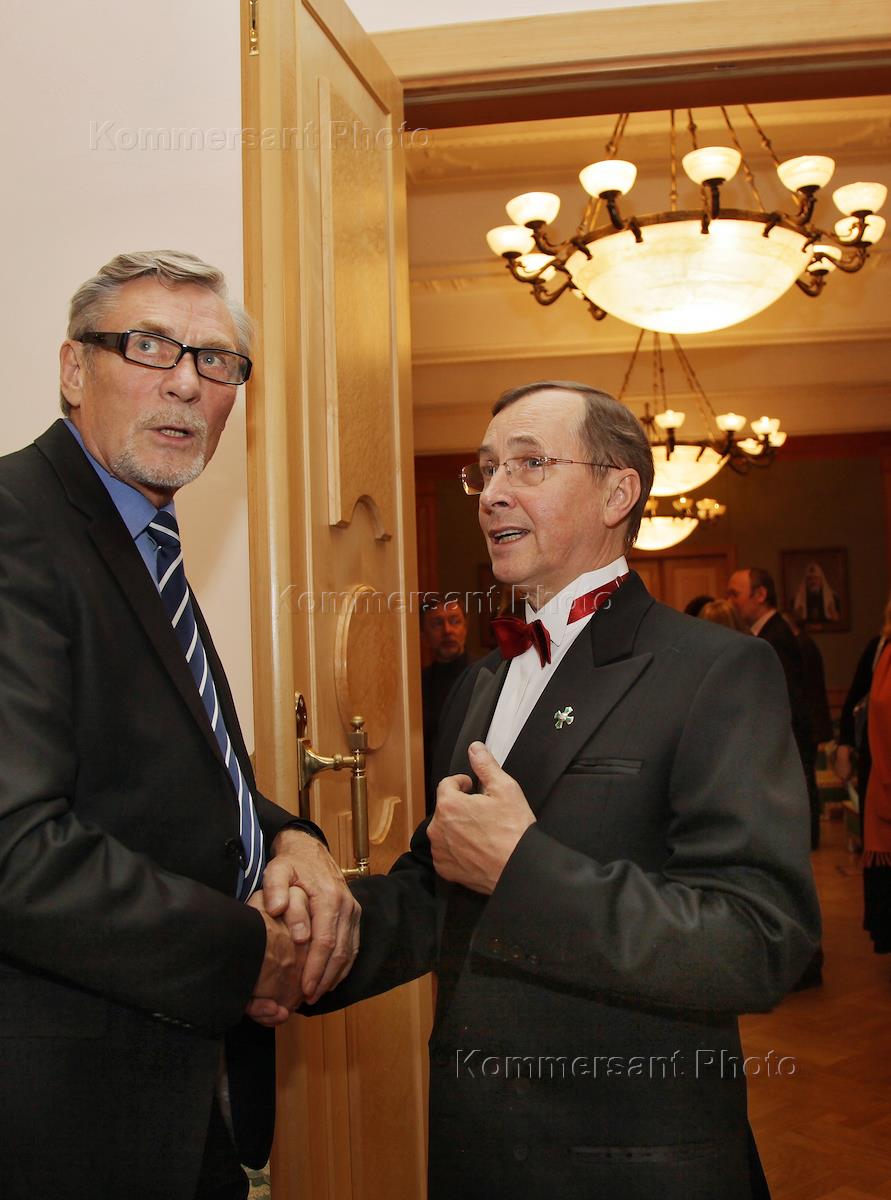 Художественный руководитель Московского художественного театра (МХТ) имени Чехова Олег Табаков (слева) и актер Николай Бурляев (справа) в зале Церковных Соборов Храма Христа Спасителя во время закрытия II Славянского форума искусств "Золотой Витязь".