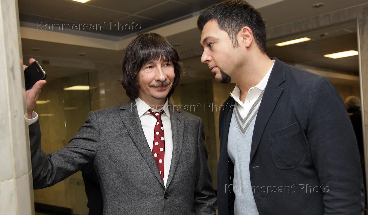 TV presenter, film director Alexander Gordon (left) and actor Leonid Yarmolnik (right) at the premiere of Alexander Gordon's film "Brothel Lights" at the Concert Hall "October".