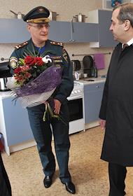Министр России по делам гражданской обороны, чрезвычайным ситуациям и ликвидации последствий стихийных бедствий Владимир Пучков (слева) на церемонии торжественного открытия жилого комплекса "Благодать" для сотрудников МЧС Росси в Новомосковском административном округе Москвы.