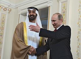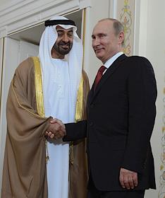 Президент России Владимир Путин (спарва) и наследный принц Абу-Даби, заместитель Верховного главнокомандующего Вооруженными силами Объединённых Арабских Эмиратов Мухаммед Аль Нахайян (слева) во время встречи.