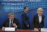 Рабочая поездка председателя правительства России Дмитрия Медведева в Калининградскую область. Слева направо: министр здравоохранения России Вероника Скворцова, полномочный представитель президента России в Северо-Западном федеральном округе Николай Винниченко, председатель правительства России Дмитрий Медведев и заместитель председателя правительства России Ольга Голодец во время посещения Центра сердечно-сосудистой хирургии.