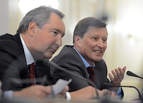 Заместитель председателя правительства России Дмитрий Рогозин (слева) и руководитель администрации президента России Сергей Иванов (справа) на заседании Комиссии по вопросам военно-технического сотрудничества (ВТС) с иностранными государствами.