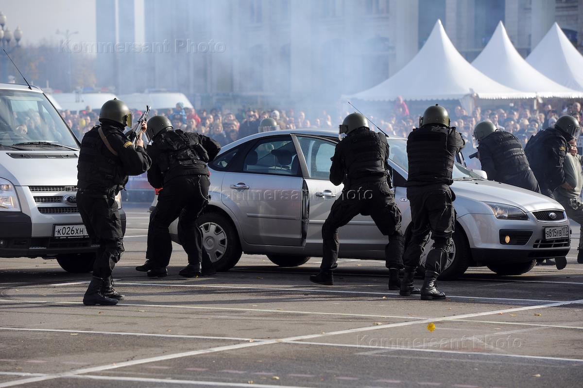 Участник первого спортивного праздника московской полиции, посвященного Дню сотрудника органов внутренних дел (ОВД) во время показательных выступлений по захвату и обезвреживанию террористов. Праздник прошел на территории спортивного комплекса "Лужники".