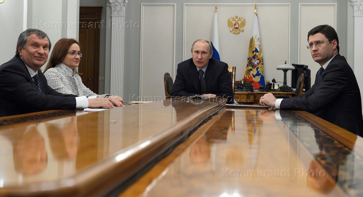Слева направо: президент, председатель правления ОАО "НК "Роснефть" Игорь Сечин, помощник президента России Эльвира Набиуллина, президент России Владимир Путин и министр энергетики России Александр Новак в Ново-Огарево во время видеоконференции по случаю запуска первой очереди Бованенковского газового месторождения.
