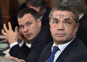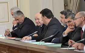Президент ОАО "Нефтегазовая компания "РуссНефть" Михаил Гуцериев (слева) и генеральный директор ОАО "Сургутнефтегаз" Владимир Богданов (справа) на заседании Комиссии по вопросам стратегии развития топливно-энергетического комплекса (ТЭК) и экологической безопасности. Заседание прошло в Ново-Огарево.