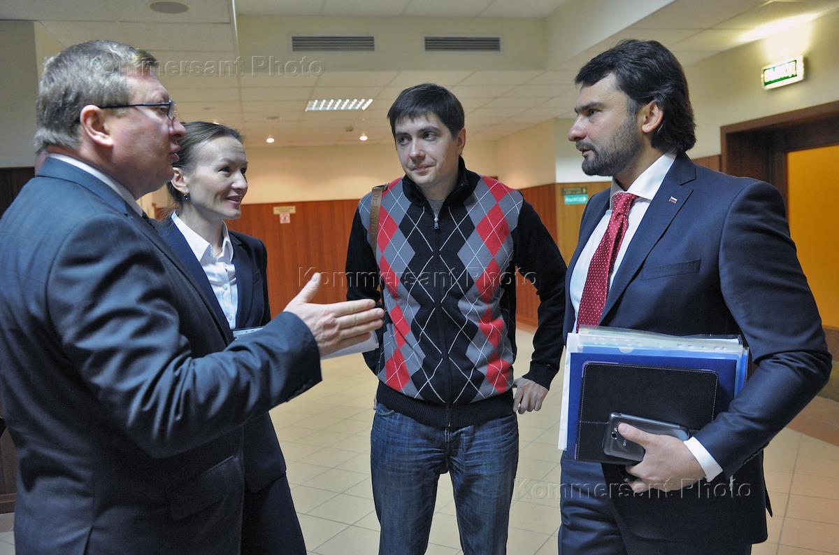 Бывший сотрудник Следственного комитета России Андрей Гривцов (второй справа), обвиняемый в вымогательстве взятки в размере 15 миллионов долларов, и его адвокат Татьяна Лучкина (вторая слева) во время оглашения оправдательного приговора в Мосгорсуде.