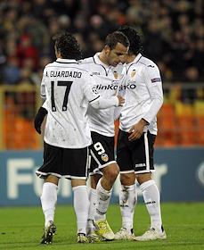 Лига чемпионов УЕФА 2012-2013. Матч между командами БАТЭ (Борисов, Беларусь) и "Валенсия" (Испания). Игроки ФК "Валенсия" Андрес Гуардадо (слева) и Роберто Сольдадо (в центре) во время матча.
